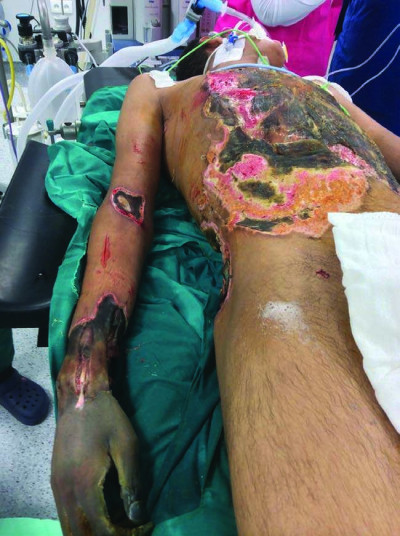 The patient was received in the Accident and Emergency Department, Burn and Plastic Surgery Centre, AlGalaa Military Medical Complex, Cairo, Egypt. The patient’s history revealed that the patient had been subjected to a high-voltage electric burn 12 days before. The patient was transferred from another country 12 days after the burn injury. He was then admitted to the intensive care unit at our center. He was assessed and managed by a multidisciplinary team that included plastic surgeons, intensivists, psychologists, a cardiothoracic surgeon, a vascular surgeon, an orthopedic surgeon, and a nutritionist. The intensivists started the management protocol by replacement therapy, resuscitation, and full investigations. It was obvious that his right hand and distal half of the forearm were mummified as shown in Figure 2. His left hand and two-thirds of the distal forearm showed impaired circulation.