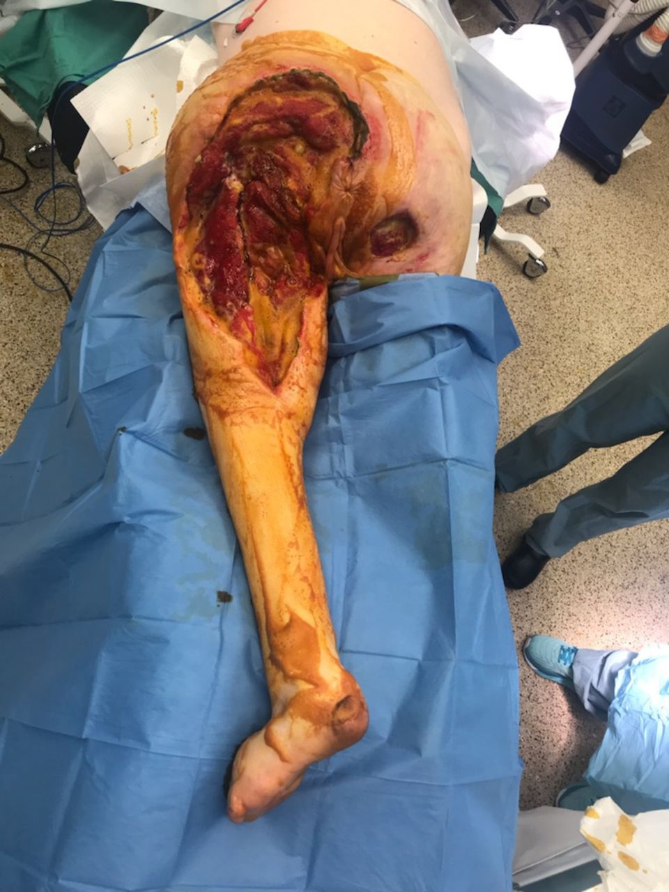 Once she was stabilized from an infectious perspective, which included an end sigmoid colostomy to optimize wound care, we established nasoduodenal nutrition with the goal of giving her 2 g/kg of protein per day. We then had a long discussion with the patient, her family, and the plastic surgery team before concluding that if we did not achieve coverage of her wound and give her a durable, well-vascularized weight-bearing surface, any attempt at closure would ultimately fail. In this context, particularly given the fact that she did not use her legs, we agreed that the least complex operation with the greatest chance of long-term success was a fillet of leg flap.