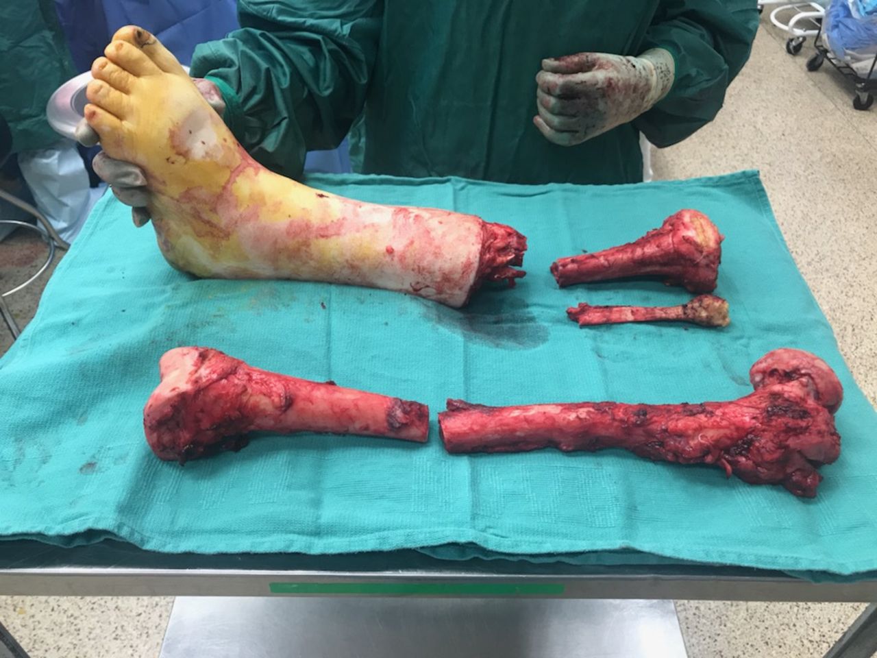 Fig 2: Mid-shank guillotine amputation followed by removal of the remaining tibia and fibula and disarticulation of the femur.