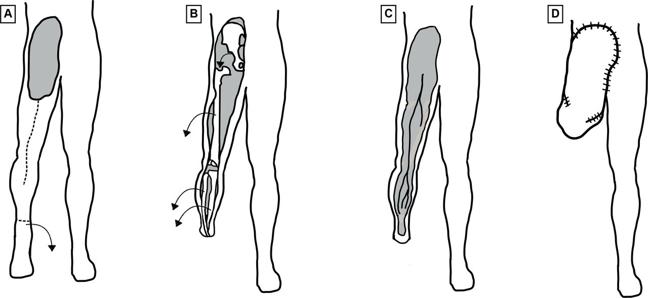 Fig 3: A step-by-step drawing of the surgical process. (A) Incision from the gluteal cleft to popliteal fossa and guillotine distal shank amputation. (B) Sever all knee ligaments. Remove the tibia and fibula. Remove femur after distal mobilization and disarticulate hip posteriorly through the decubitus ulcer. (C) Define vascular anatomy to avoid injury. (D) The folded newly created final flap. Created by approximating the skin of the most distal portion of the flap (the mid-shank) to the superior most aspect of the sacral decubitus ulcer and suturing laterally and medially flap to pelvis, then flap to flap to close the wound.